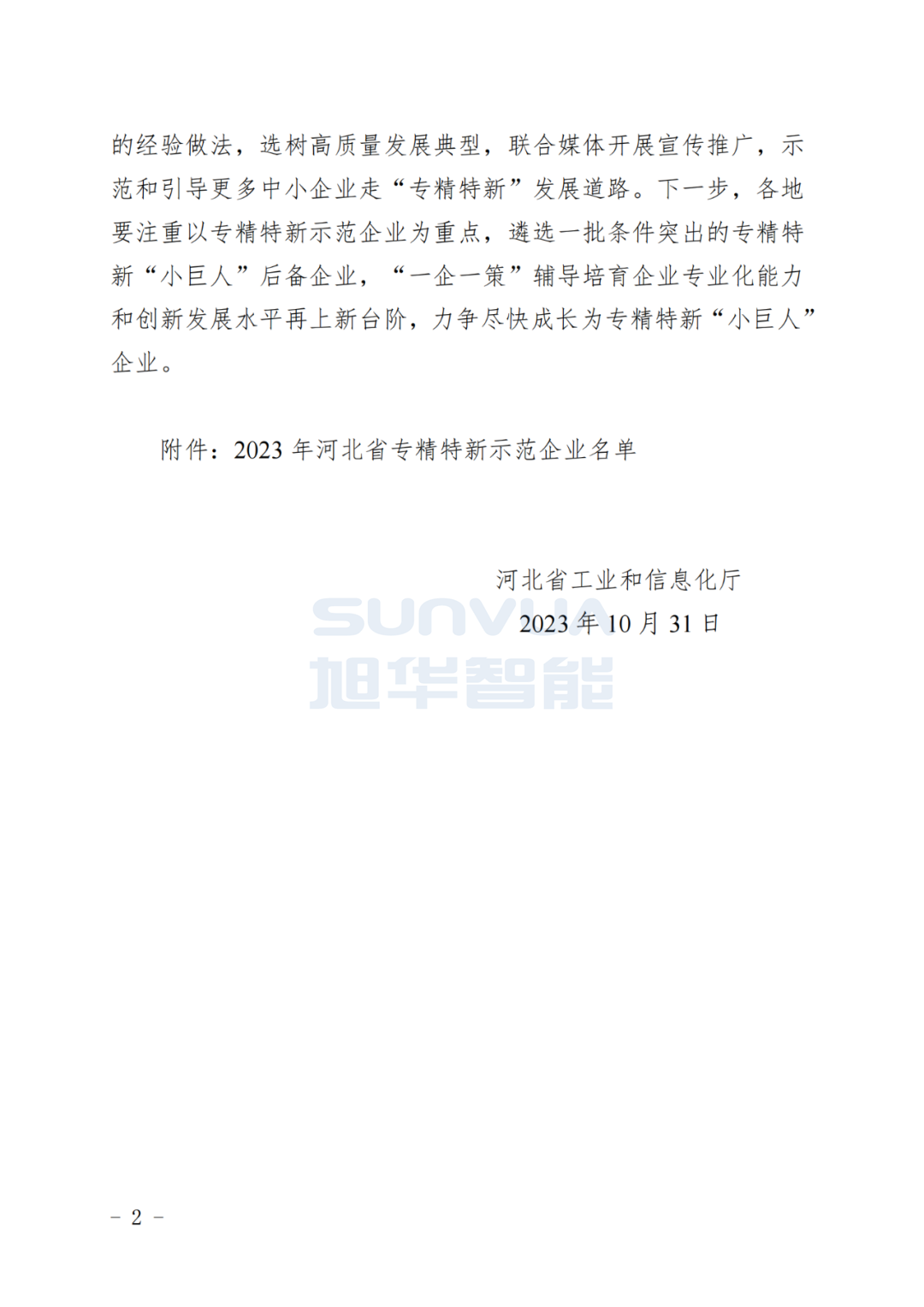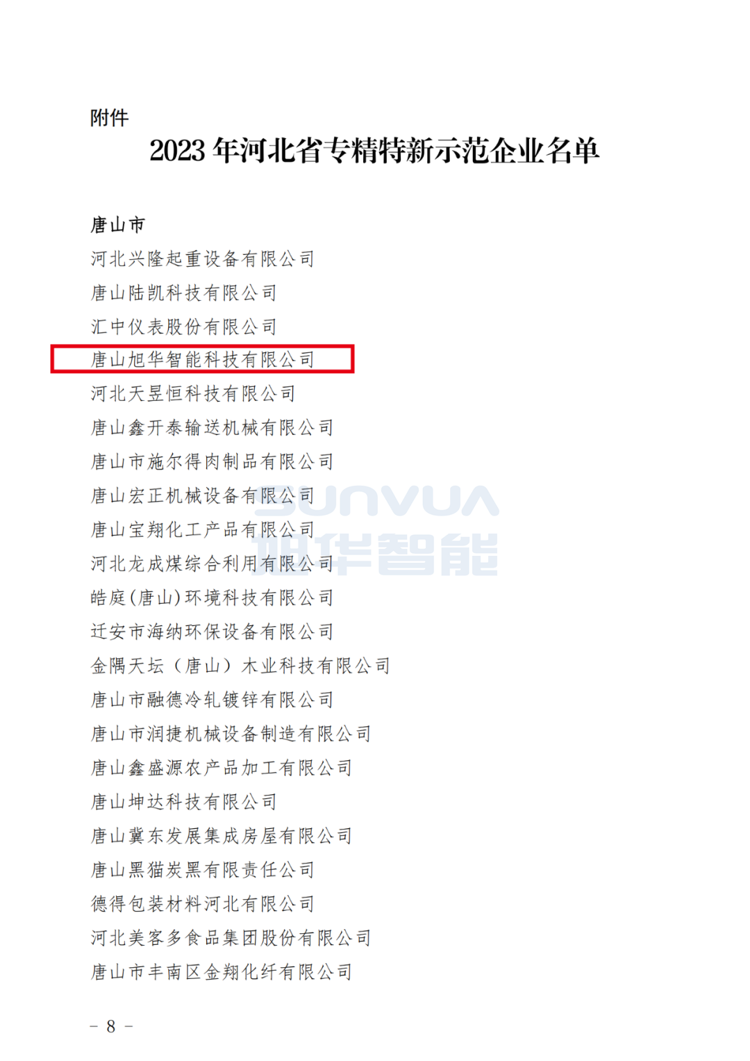 近期,河北省工业和信息化厅公布了《关于公布2023年河北省专精特新示范企业名单的通知》,唐山旭华智能科技有限公司名列其中,凭借过硬的专业技术创新能力,荣获河北省“专精特新”示范企业称号。